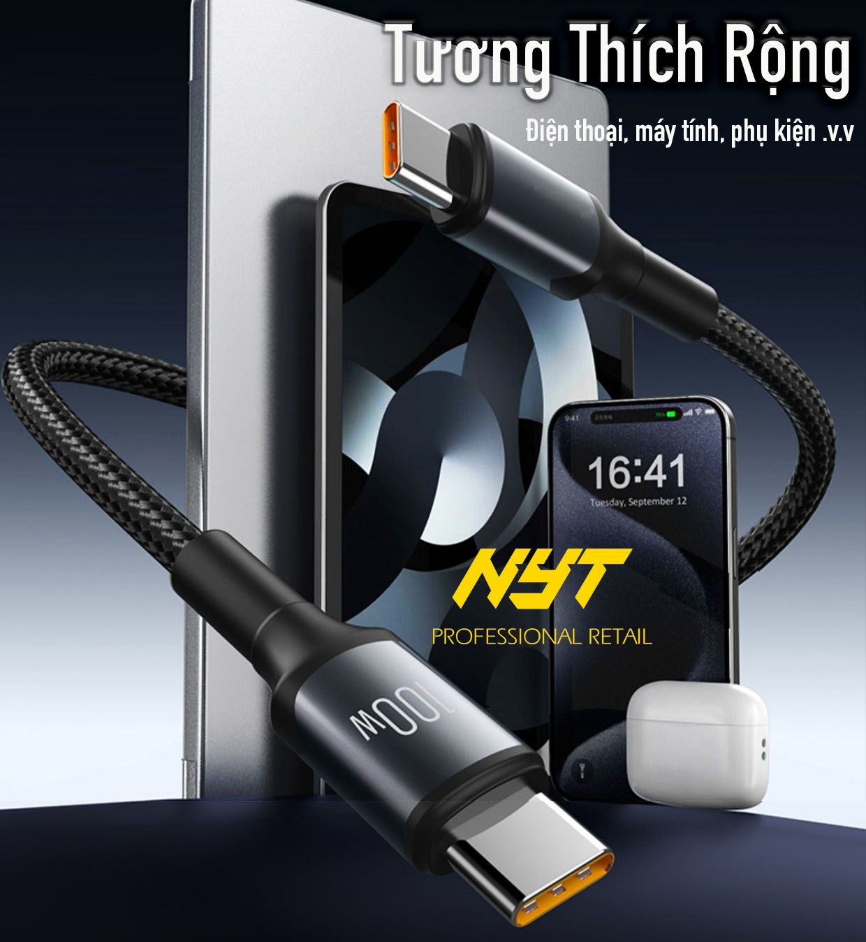 Cáp Sạc Nhanh Type C PD 100W Dù Nhôm Đen Cao Cấp NYT N93